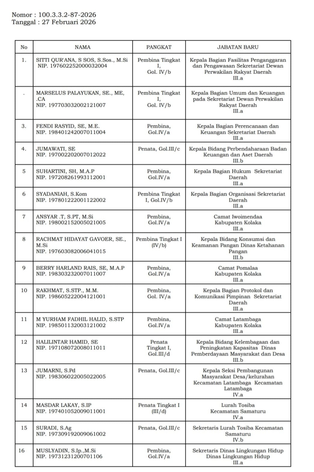 Inilah daftar nama nama pejabat eselon III dan IV yang dimutasi sesuai data dari BKPSDM Pemda Kolaka.